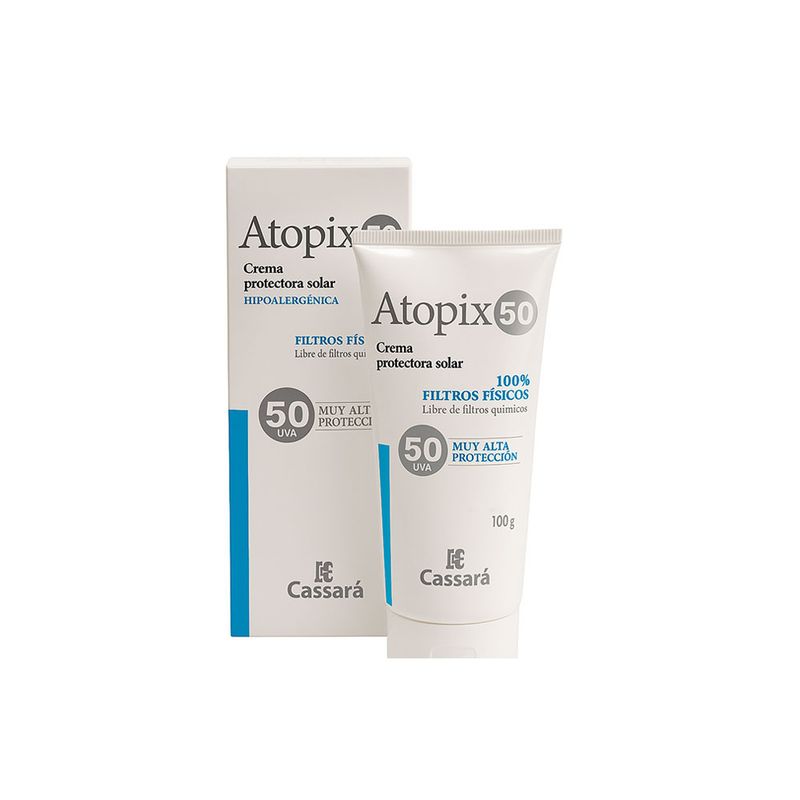 Protector Solar SPF 50 hipoalergénica compuesta 100% del filtros físicos. Atopix 50 es un producto especialmente diseñado con filtros físicos minerales para proteger la piel de las radiaciones solares, en niños y adultos. Envase x 100 gr.